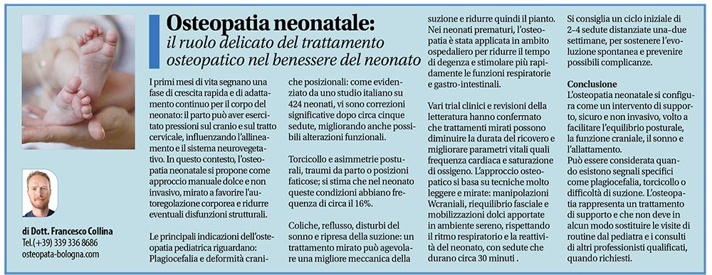 L’osteopatia neonatale si configura come un intervento di supporto, sicuro e non invasivo, volto a facilitare l’equilibrio posturale, la funzione craniale, il sonno e l’allattamento.