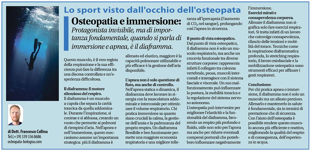 Per chi pratica apnea o immersione, il diaframma non è solo un muscolo ma un alleato prezioso. Allenarlo e mantenerlo in salute è fondamentale, sia in termini di prestazione che di sicurezza. Con l’aiuto dell’osteopatia è possibile rendere questo muscolo ancora più efficiente e reattivo, migliorando la qualità del respiro e di conseguenza, dell’esperienza in acqua.